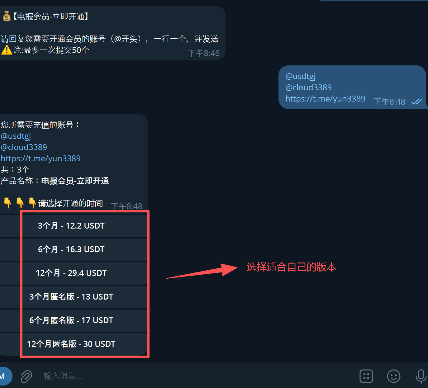 3. 选择相应版本的月份,等待即可(一般在10分钟内开通成功)都是系统全自动的。开通成功,机器人会发通知。