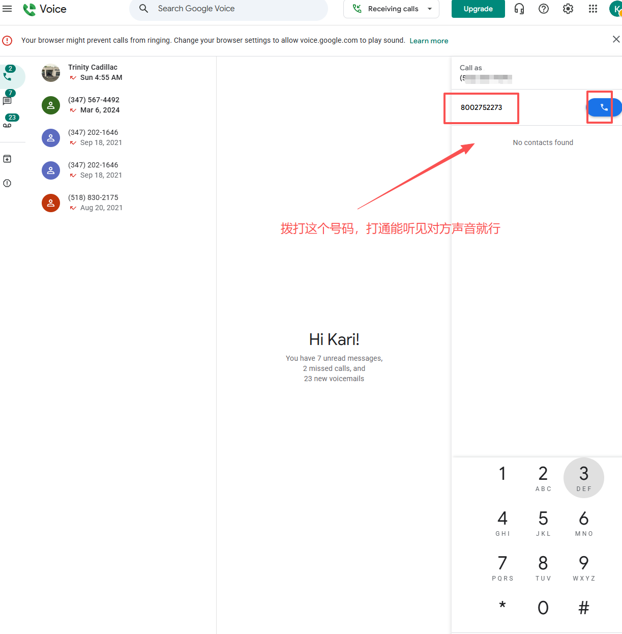 挂稳7天后,打开 voice.google.com 拨打电话, 8002752273 (每隔2个月需要重复这一步骤保号)