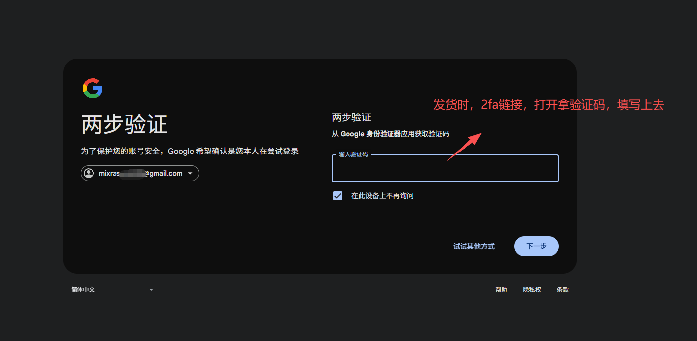 第一种. 2fa链接验证 ( 发货时,打开2fa链接,打开拿验证码,填写上去 )