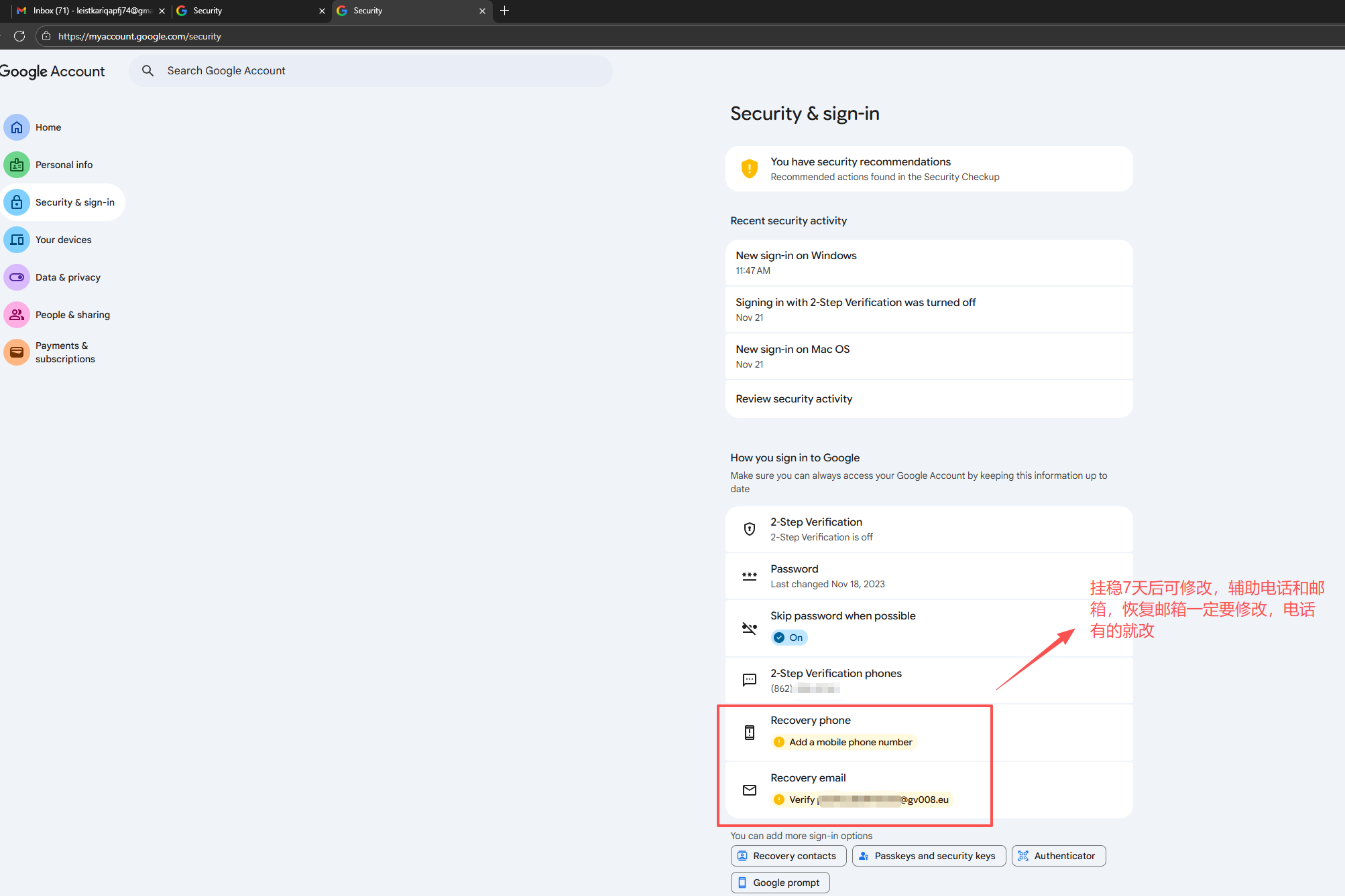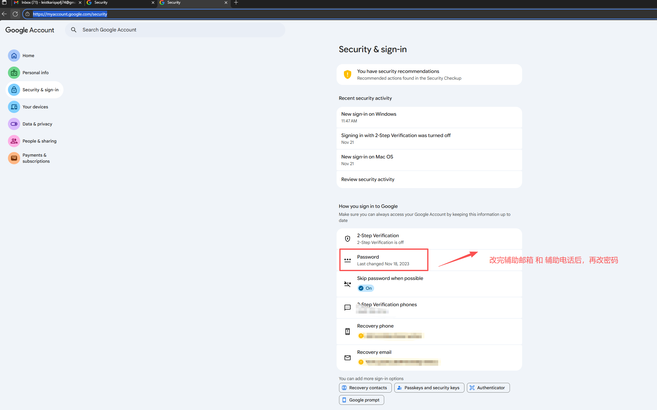 1.修改辅助邮箱(必改)和辅助电话(可选) (也叫恢复邮箱,恢复电话)